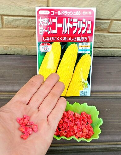 とうもろこしの種蒔きから収穫迄をまとめました! 品種は毎年同じ「ゴールドラッシュ」 3/7 種蒔きしました! 1か所二粒ずつ40ポット作りました! たっぷり水やり後 もみ殻を載せて、新聞紙をかぶせて発芽を待ちます 3/17発芽を確認\(^o^)/ まっすぐ上に…